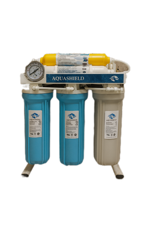تصفیه آب خانگی AQUASHIELD – مدل اسمز معکوس (Reverse Osmosis) دستگاه تصفیه آب خانگی AQUASHIELD مجهز به سیستم پیشرفته RO بوده و با بهرهگیری از ۵ تا ۶ مرحله فیلتراسیون، قادر است املاح مضر، کلر، رسوبات و بو و مزه نامطلوب آب شهری را بهطور کامل حذف کند. وجود سه هوزینگ استاندارد و فیلترهای تکمیلی، کیفیت آب خروجی را در بالاترین سطح تضمین میکند.